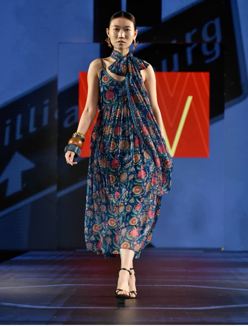 If history could be woven into fabric, it would look like this. The collection was a tribute to India’s rich textile traditions, infused with contemporary silhouettes. An ode to the timeless elegance of Indian traditions capturing the grace of Indian wear with a modern twist. Featuring soft flowing silhouettes, the designs highlight intricate craftsmanship with thread and mirror work. Picture flowing fabrics adorned with shimmering gold and silver threadwork, and regal hues of maroon, sapphire, and emerald. Every piece, felt like a bridge connecting the past to the present. It infused tradition with a sharp modern edge that made it stand out on this global platform.