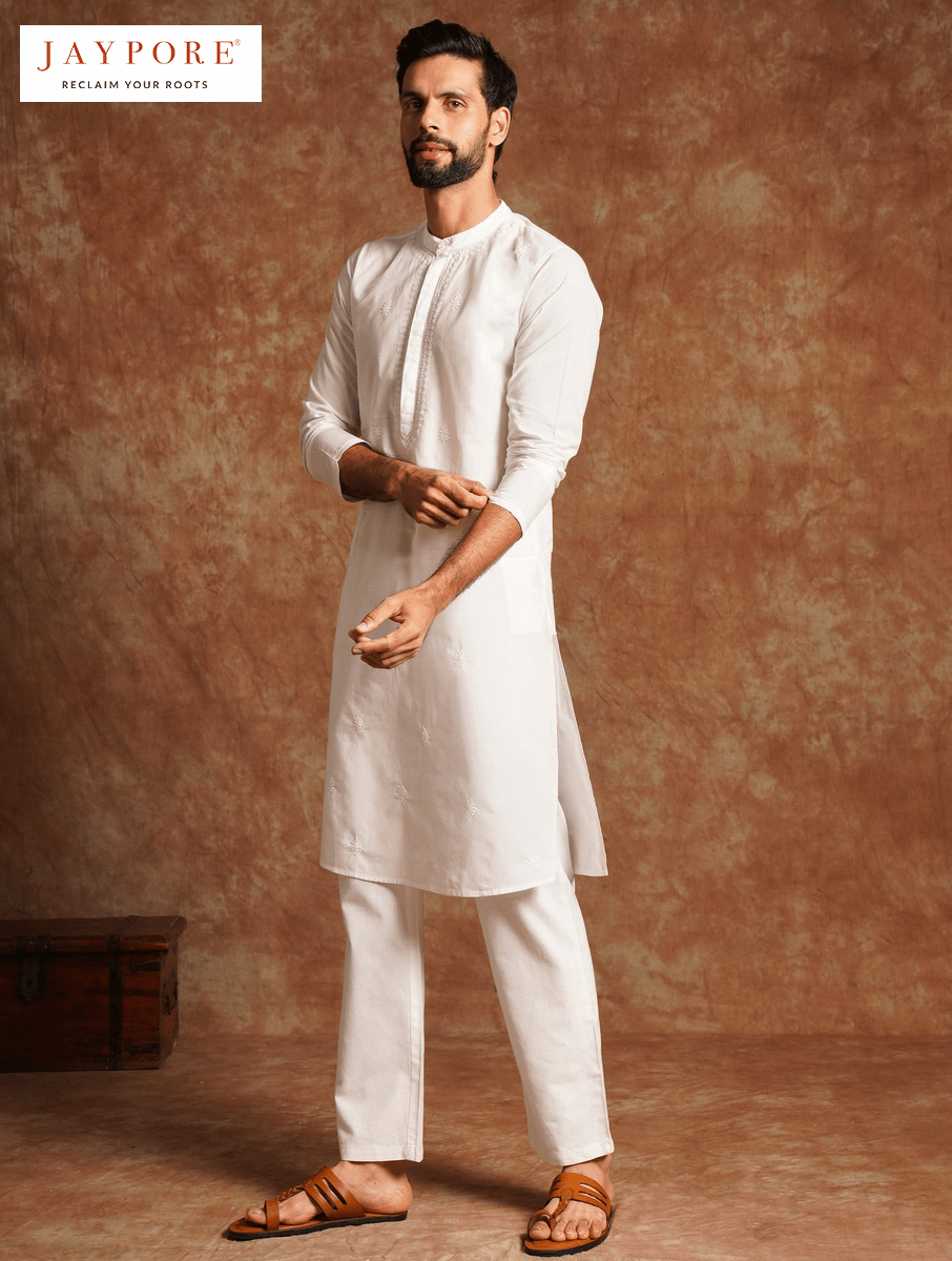 Men couldopt for a White Chikankari Mandarin Collar Kurta from Jaypore. The artisanal embroidery offers a subtle texture that looks stunning when paired with a pair of white pants or pyjamas.