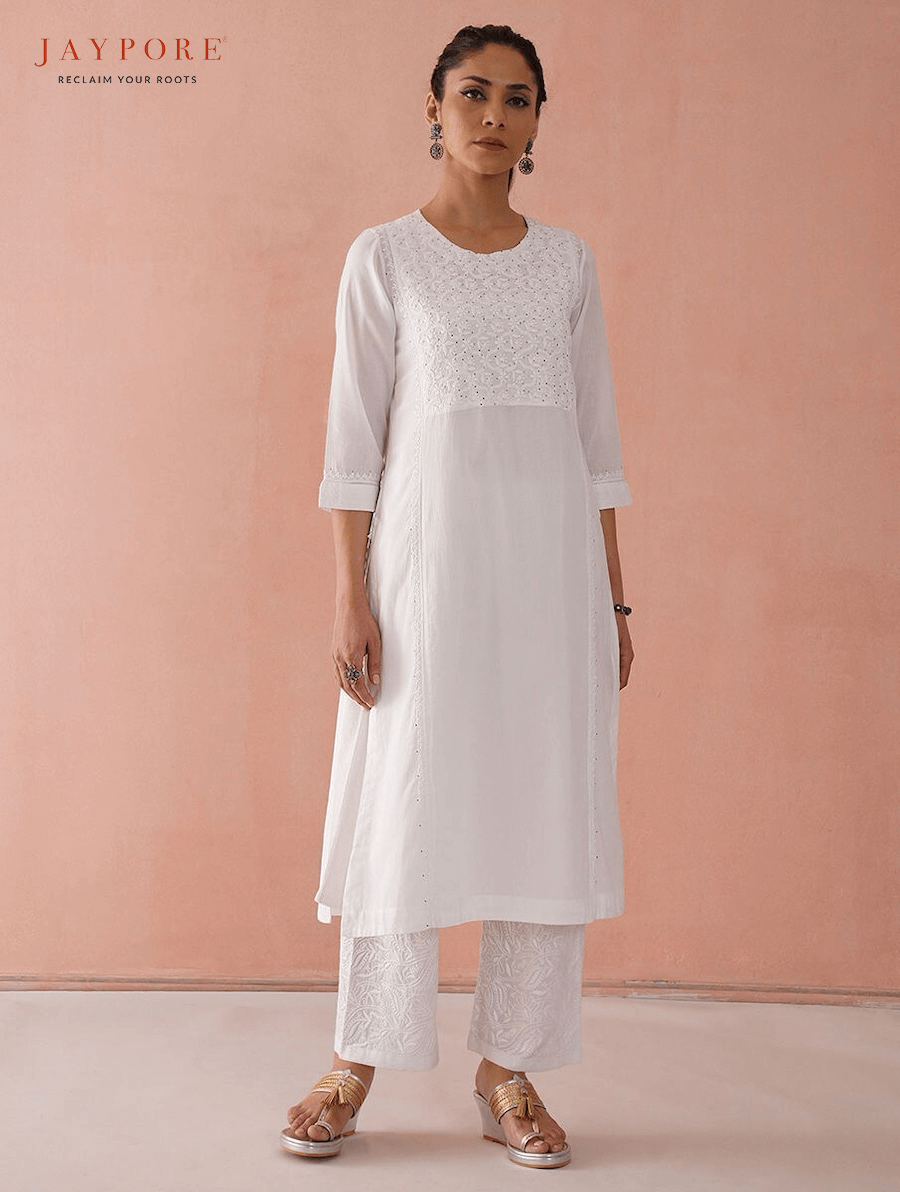 Women canembrace the ethereal charm of Jaypore’s White Cotton Chikankari Kurta. The intricate embroidery is a testament to sustainable fashion with pieces designed to be cherished long after the festivities end.