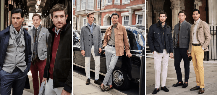 The colour palette features rich burgundies and warm tobaccos playing against classic staples like navy blue and forest green, with quintessentially British windowpane checks, Prince of Wales prints, and herringbone patterns across blazers and trousers.