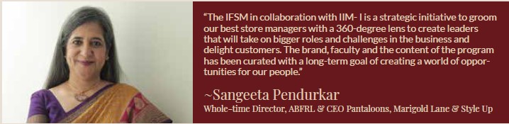 ABFRL has always been all about building the Best Brands with Best People. While we attract the best talent in the fashion retail industry, it is important to ensure that our best stay ahead of the curve. This compelled our HR Leaders at ABFRL and Pantaloons to envision a path for our self-empowered Store managers who are open to learning and have a clear goal for themselves. With the IFSM, Pantaloons collaborated with IIM-Indore, to create a comprehensive plan to identify the most promising Store Managers and accelerate their growth to become the next ABMs for the brand.