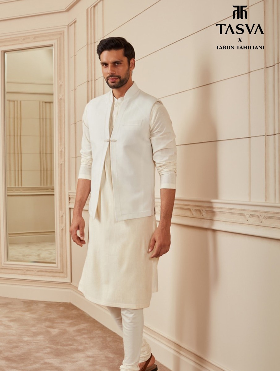 For the weddings and festivals ahead, this soft hue brings a gentle, uplifting twist to traditional silhouettes. TASVA interprets it through ivory sherwanis, embroidered kurtas, and tonal bandhgalas that balance modern style with cultural roots. At Jaypore , this shade moves across handwoven sarees, chikankari kurtas, artisanal dupattas and a lot more. This understated shade is juxtaposed with intricate textures and detailed craftsmanship that take centre stage, creating ensembles that feel timeless and effortlessly graceful. Needless to say, it works beautifully for day weddings and intimate celebrations.